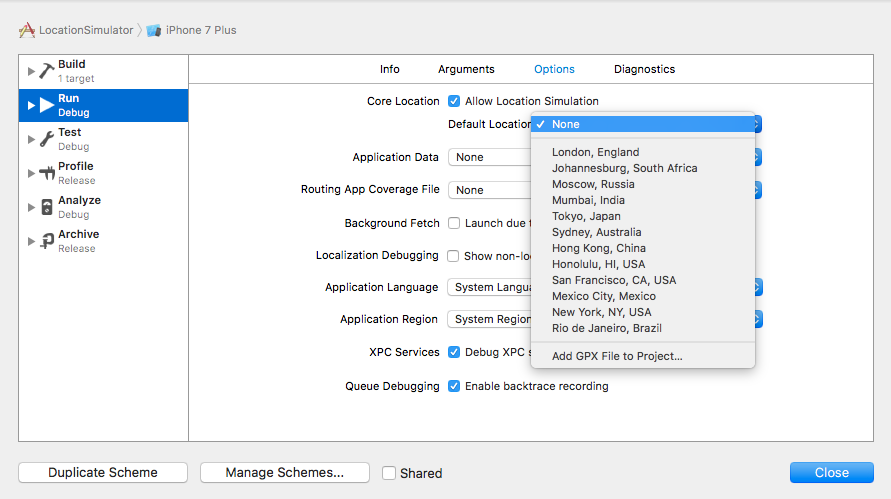Το iOS SDK περιλαμβάνει την δυνατότητα προσομοίωσης της γεωγραφικής θέσης του χρήστη, γιατί η θέση του πάνω στον χάρτη είναι σημαντική είσοδος για πολλές κινητές εφαρμογές, οι οποίες μπορούν να αλλάξουν την πληροφορία στην οθόνη και να στείλουν ειδοποιήσεις